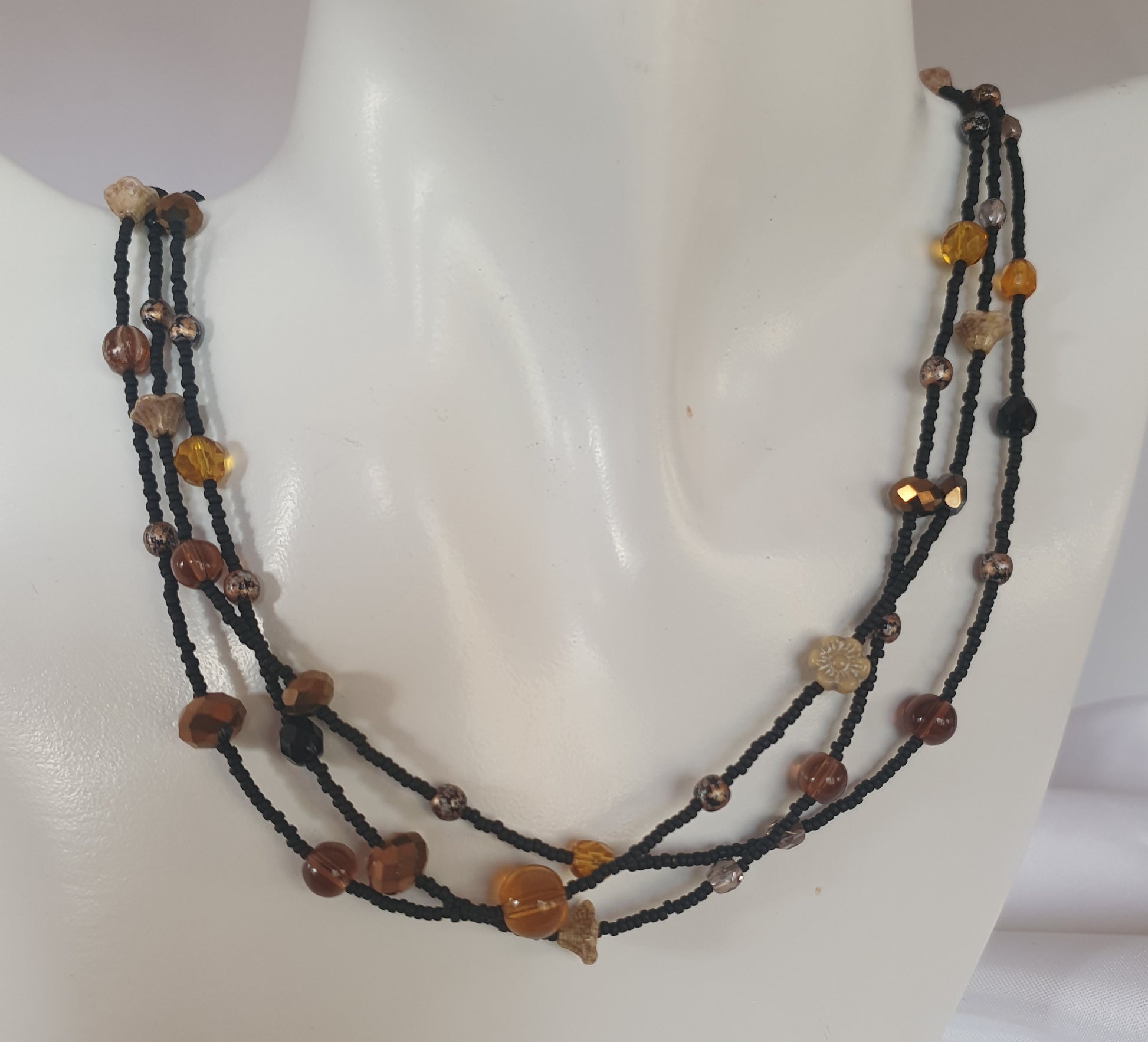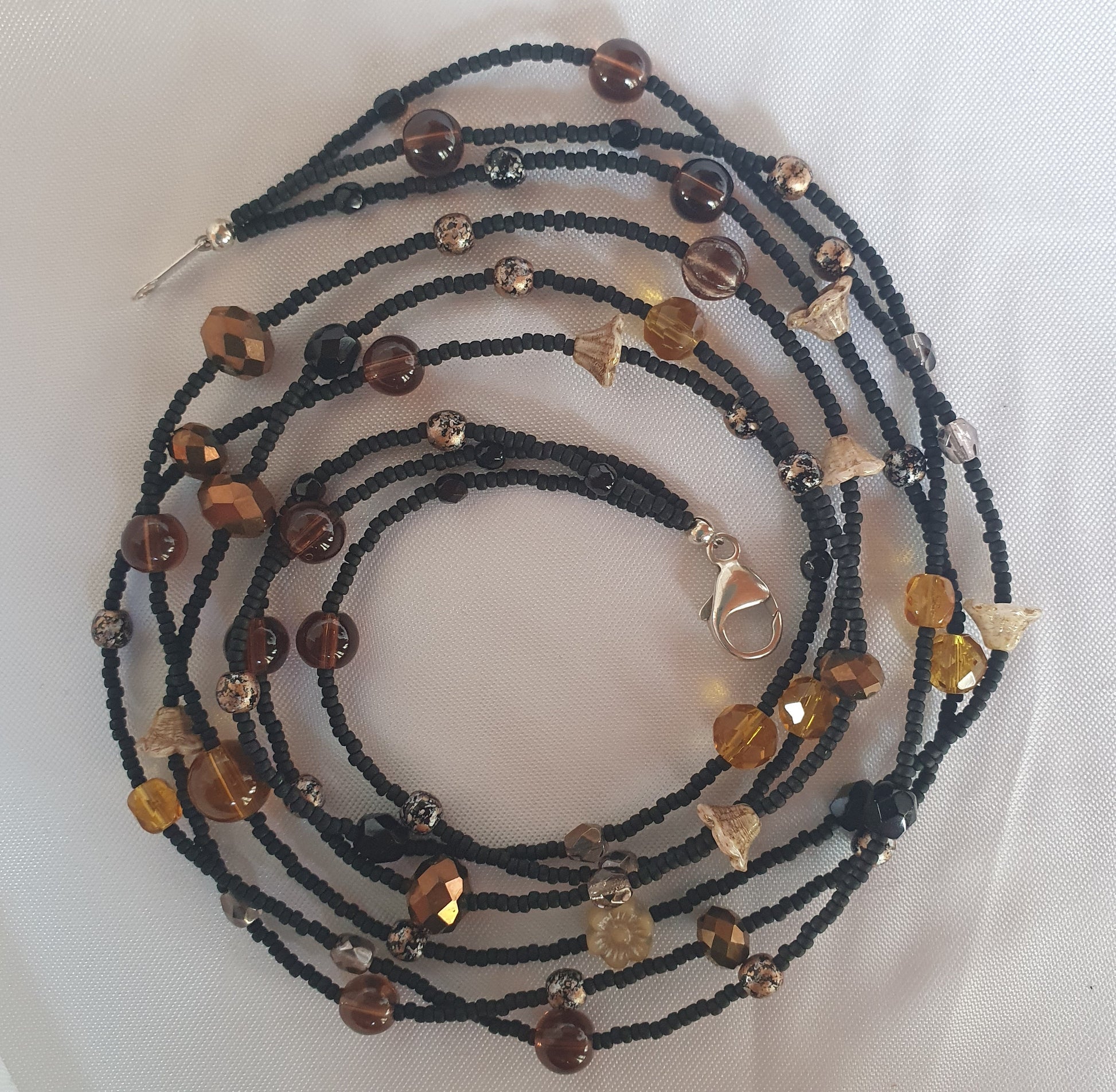 This Czech Glass Hand beaded necklace exudes luxury and sophistication. Handcrafted with black and brown Czech glass beads, it features a sterling silver clasp for added elegance. Elevate any outfit with this exclusive piece that is sure to catch the eye of all art and fashion connoisseurs.