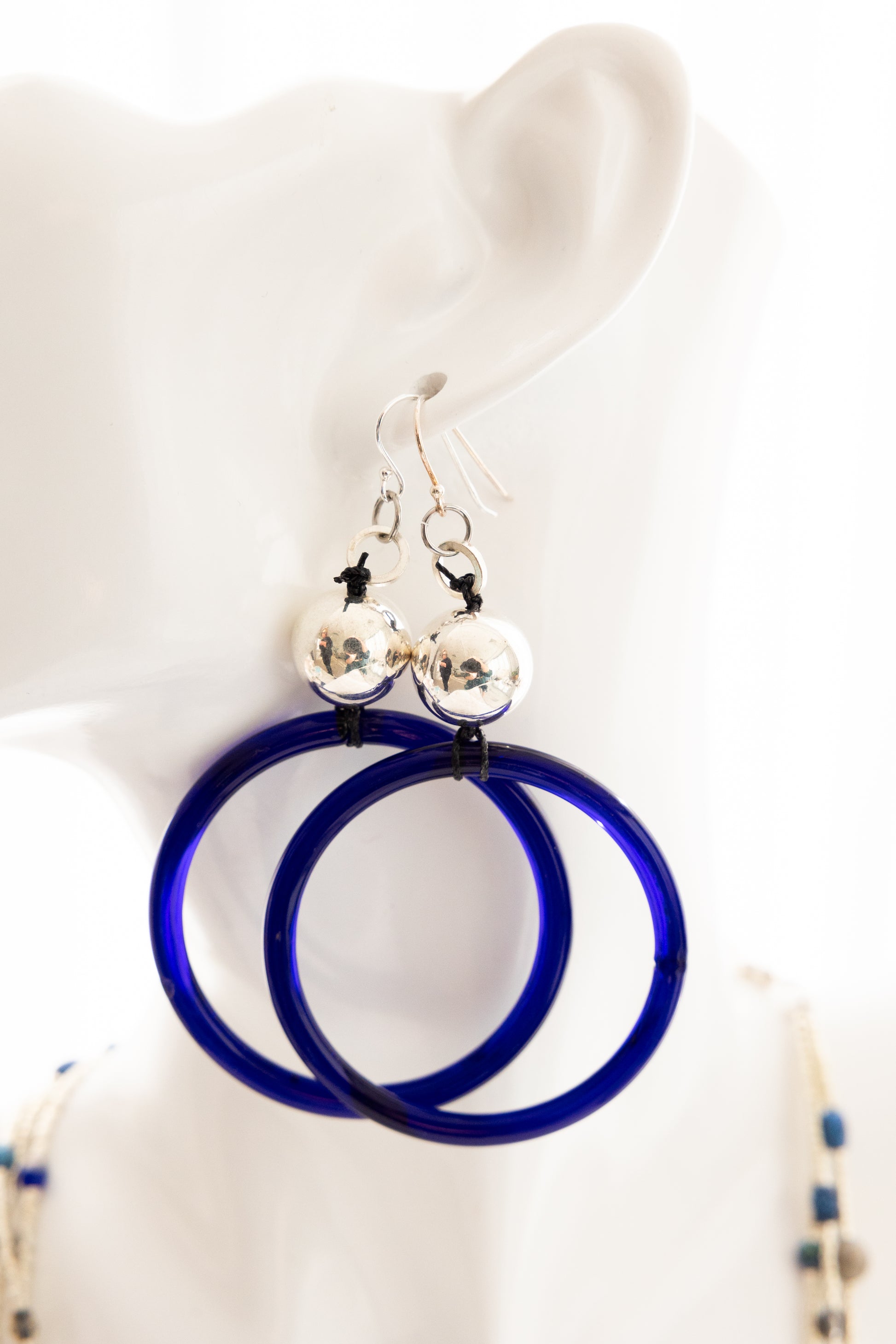 Elevate your style with these exquisite hand-blown glass hoops, featuring a rich cobalt blue hue that captures light beautifully. Paired with elegant sterling silver ear wires, they offer a refined touch to any ensemble. These unique earrings blend artisanal craftsmanship with timeless sophistication, making them a subtle yet striking accessory for both day and evening wear.