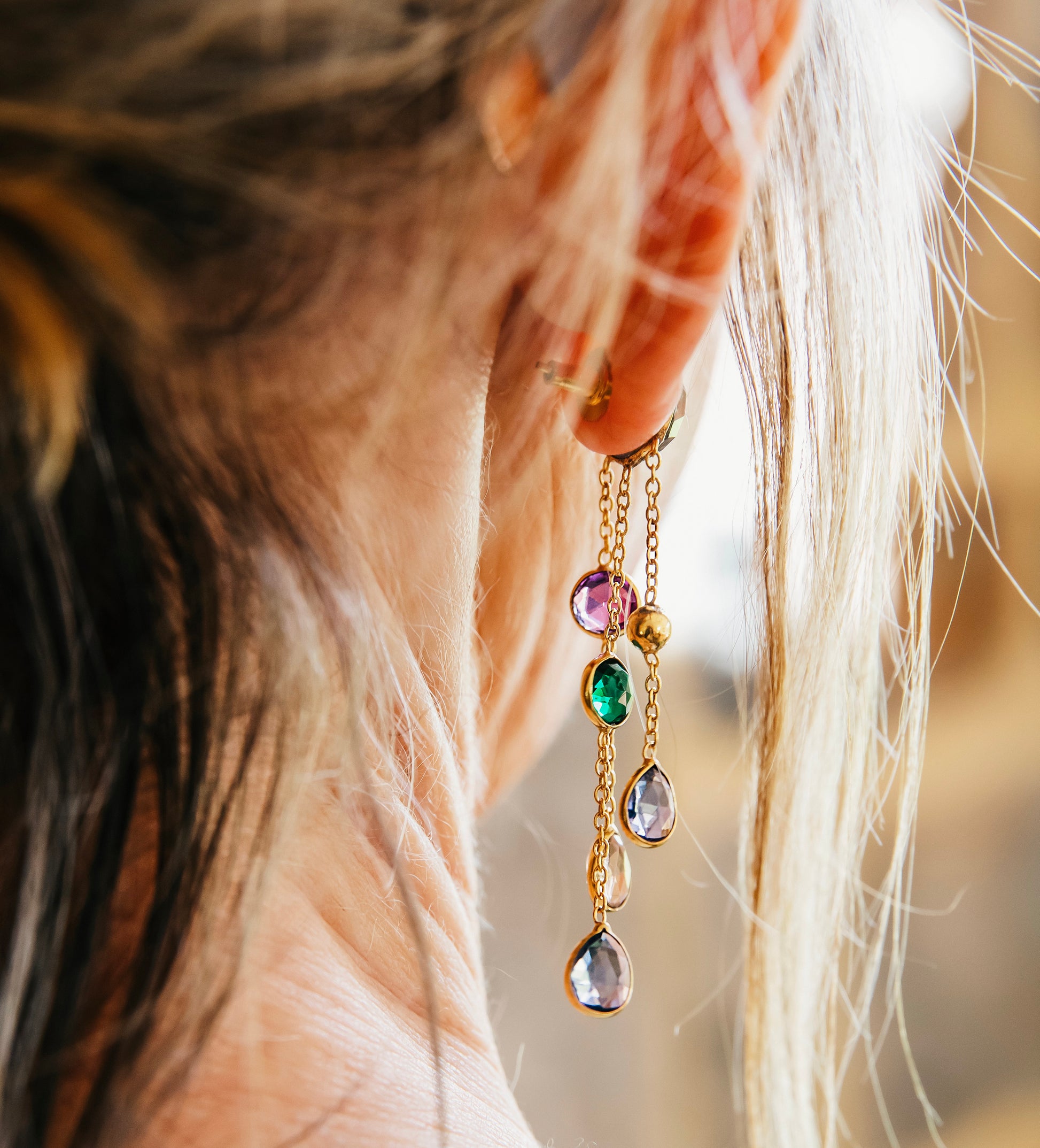 Indulge in luxury with our Smokey Topaz earrings adorned with pink, green, and blue topaz and citrine stones, elegantly set on 18k gold plated chains. Elevate any outfit with the sophistication and exclusivity of these handcrafted earrings. A true fusion of art and fashion.