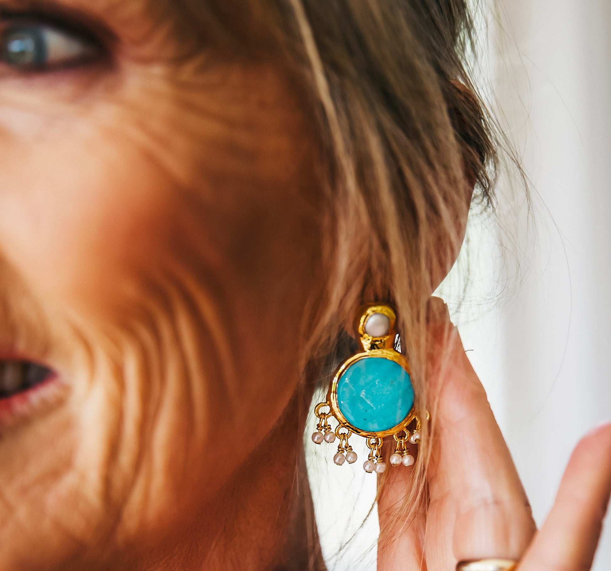 Elevate your ensemble with this exquisite piece featuring genuine turquoise stone complemented by delicate seed pearls. The luxurious 18K gold-plated setting enhances the natural beauty of these treasured elements, creating a sophisticated accessory that transitions effortlessly from day to evening wear. A timeless investment for the discerning collector.